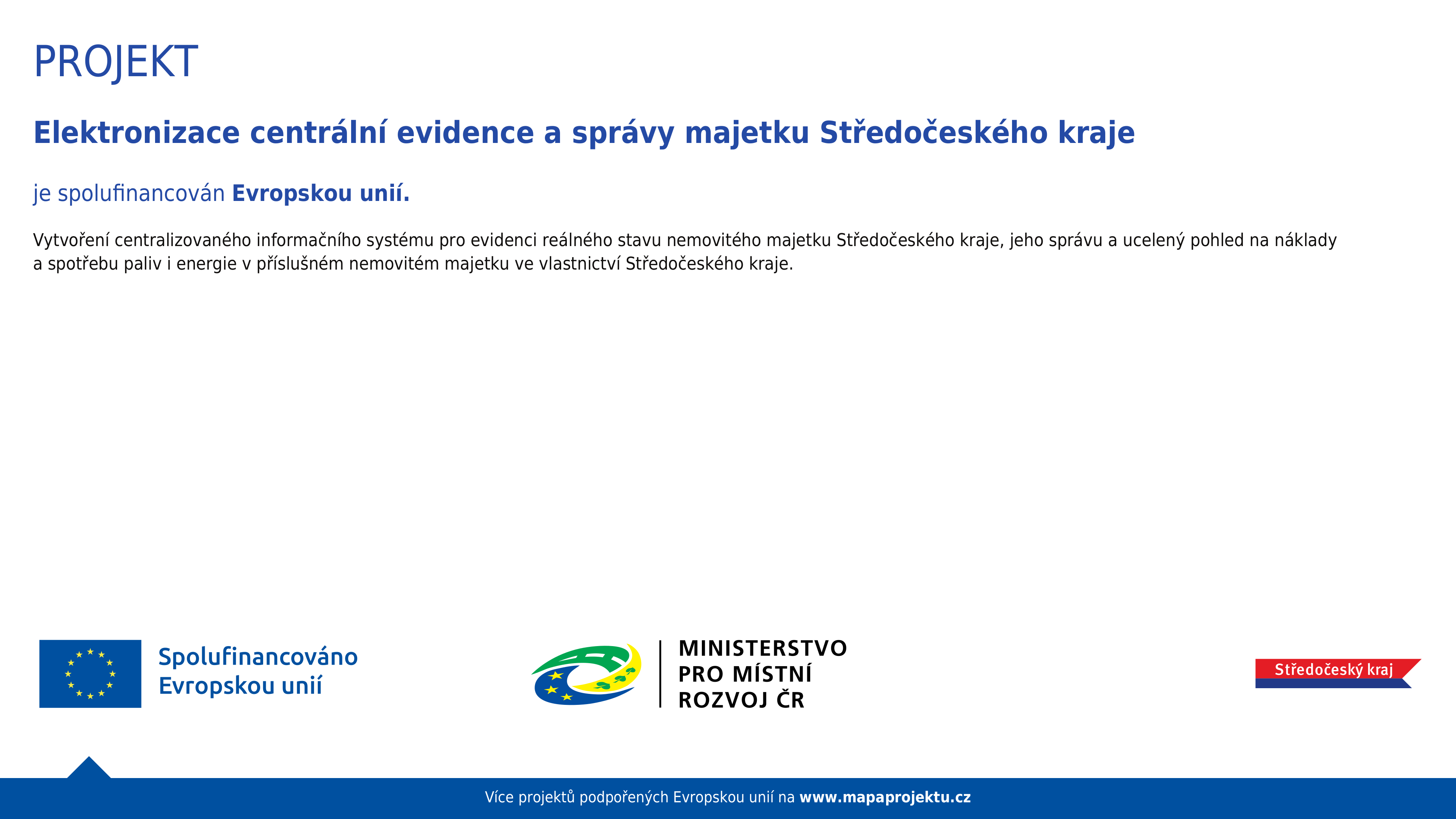 Středočeský kraj realizuje projekt "Elektronizace centrální evidence a správy majetku Středočeského kraje" v rámci kterého bude pořízený robustní SW nástroj pro správu a údržbu nemovitého majetku. Projekt je rozdělen do několika fází a s jeho dokončením se počítá v první polovině roku 2027.
