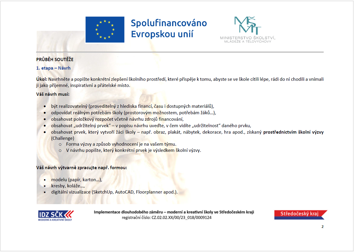 Vaším úkolem ze všeho nejdřív postavit tým. Ten by měl být složen z minimálně 5 žáků a podmínkou také je, že žáci musí být přinejmenším ze dvou ročníků. Samozřejmostí je mít svého supervizora – pedagoga, který vám se vším pomůže. Poté již můžete začít s vymýšlením toho, jak a kde konkrétně byste svou školu chtěli vylepšit. Nezapomeňte, že kreativitě a originalitě se meze nekladou. Zpracujete výtvarný model a spolu s dalšími podklady, které najdete na přiložených obrázcích, nám ho zašlete.