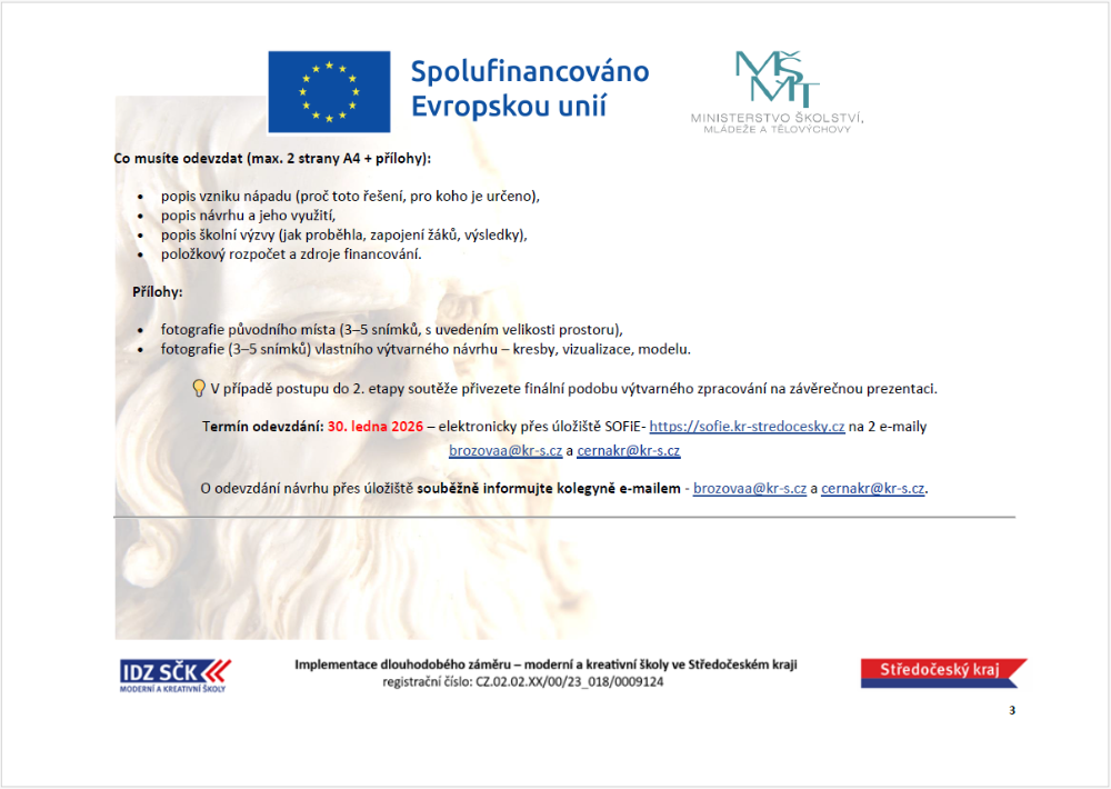 Studujete na některé ze středních škol ve Středočeském kraji? A cítíte se ve své škole dobře, líbí se vám tam? Nebo byste tam chtěli něco změnit? Máte nápad, jak to ve škole zlepšit a zařídit, aby v ní bylo všem příjemněji? Pokud ano, tak právě pro vás je určena naše nová soutěž!