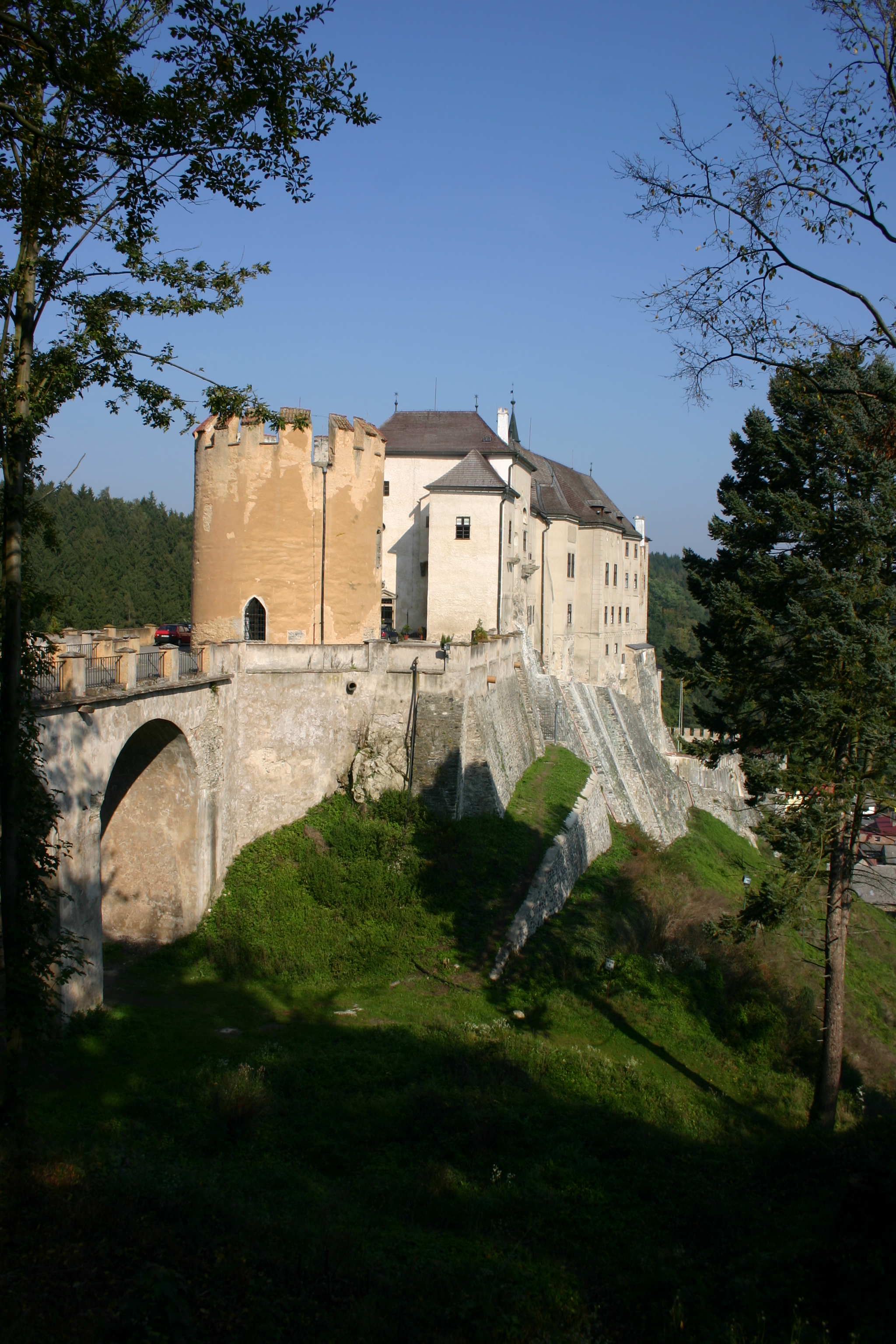 Důmyslný obranný systém hradu byl v průběhu staletí zdokonalován. K výrazné úpravě došlo zejména po roce 1467, kdy byl Český Šternberk po dlouhém obléhání dobyt a pobořen vojsky Jiřího z Poděbrad. Tehdejší majitel, Petr Konopišťský ze Šternberka, se totiž v tzv. Zelenohorské jednotě postavil proti králi. Obnova Šternberka proběhla na přelomu 15. a 16. století v pozdně gotickém stylu. Hrad byl rozšířen, vstup byl přesunut a zároveň bylo vylepšeno opevnění. Z této doby se například zachovala, a to plné výši, mohutná zděná bateriová bašta s břitem a samostatným opevněním, která byla vysunuta daleko před jižní průčelí hradu na hranu hřebenu stoupajícího od hradu směrem na jih. Snad ze stejného období pochází i okrouhlá věž stojící dnes na terase před jižní štítovou zdí.
