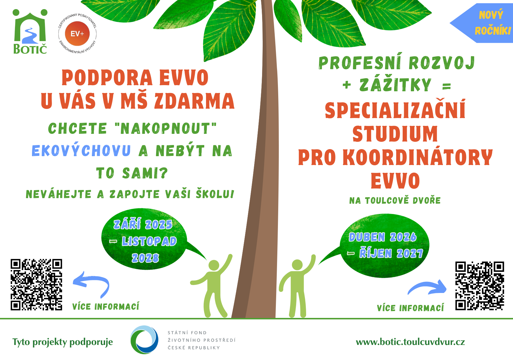 Botič o.p.s., Středisko ekologické výchovy Toulcův dvůr, nabízí specializační studium pro koordinátory EVVO v mateřských školách. Studium je akreditované a finančně jej podporuje Státní fond ŽP. Bližší informace o vzdělávacím programu, přihlašovací formulář a kontaktní osobu pro podrobnosti ke specializačnímu studiu naleznete ZDE , případně na www.botic.toulcuvdvur.cz. V příloze naleznete leták, který kromě studia propaguje program dlouhodobé metodické podpory environmentální výchovy v MŠ.