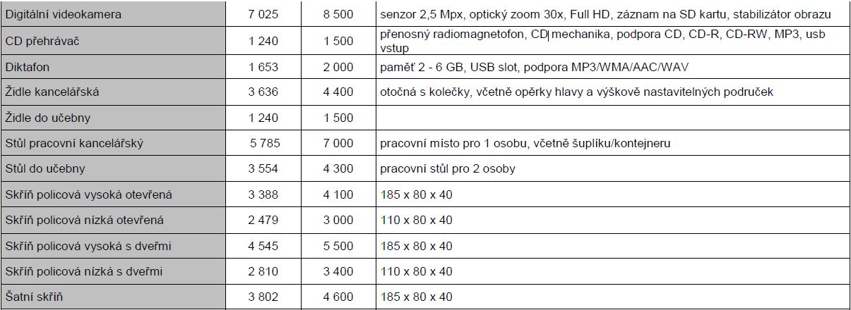 Obvyklé ceny zařízení a vybavení dle ESFCR
