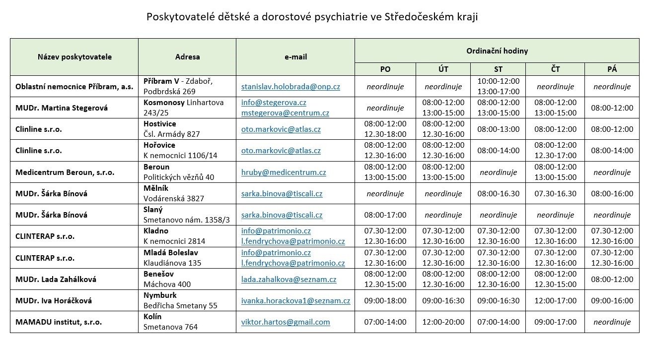 Poskytovatelé dětské a dorostové psychiatrie ve Středočeském kraji