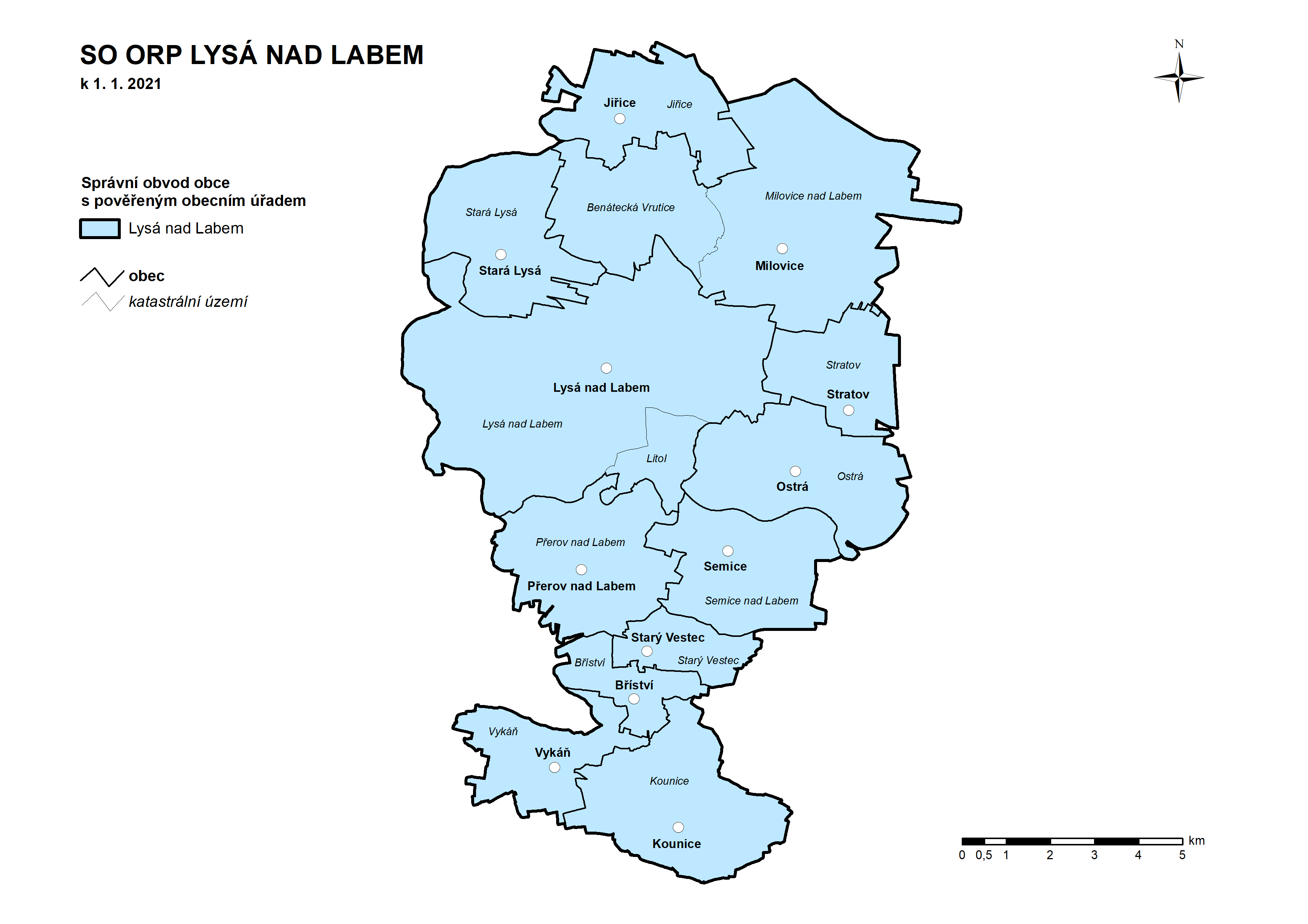 Bříství, Jiřice, Kounice, Lysá nad Labem, Milovice, Ostrá, Přerov nad Labem, Semice, Stará Lysá, Starý Vestec, Vykáň, Stratov.