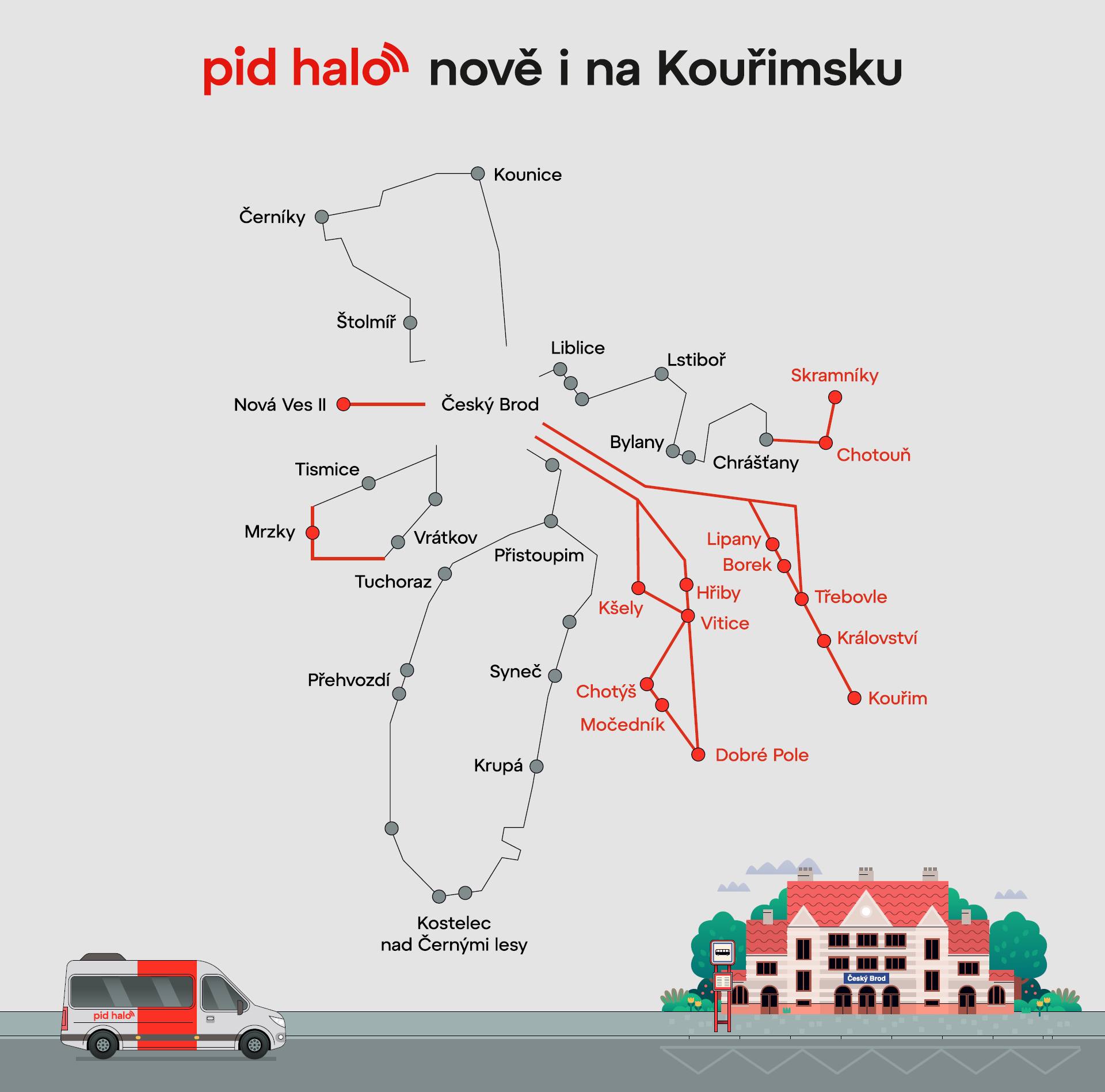 Doprava na zavolání je v okolí Českého Brodu dostupná ve všední dny od 20:25 do 00:55. Spoj je nutné objednat nejpozději 30 minut předem, přičemž přepravu zajišťují osmimístné mikrobusy. Systém propojuje jednotlivé jízdy tak, aby co nejlépe navazovaly na vlaky linky S1 z Prahy do Českého Brodu. Trasy jsou plánovány pomocí technologie využívající umělou inteligenci. Objednání je možné přes aplikaci PID Lítačka nebo na speciální infolince. Cena jízdného odpovídá tarifům PID ve Středočeském kraji. Přehled obsluhovaných obcí a další podrobnosti jsou dostupné na webu PID Haló.