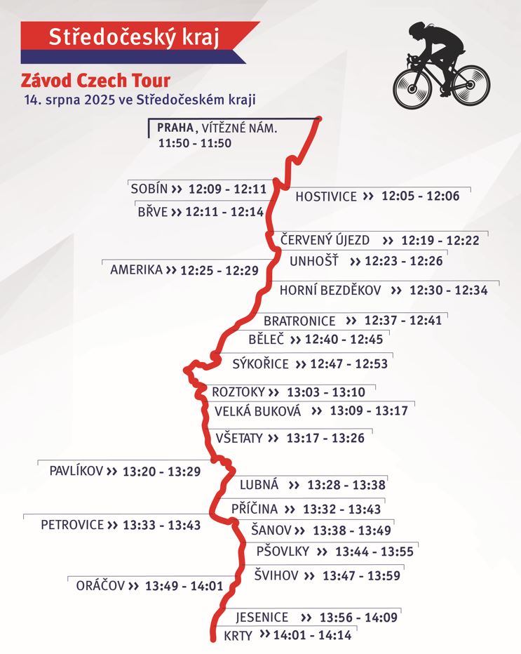 Ve čtvrtek 14. srpna odstartuje krátce před polednem z Prahy první etapa cyklistického závodu Czech Tour. Peloton se vydá přes Středočeský kraj do Karlových Varů, obyvatelé obcí, motoristé i cestující ve veřejné dopravě proto musí podle organizátorů závodu počítat s krátkodobými dopravními uzavírkami na trati.
