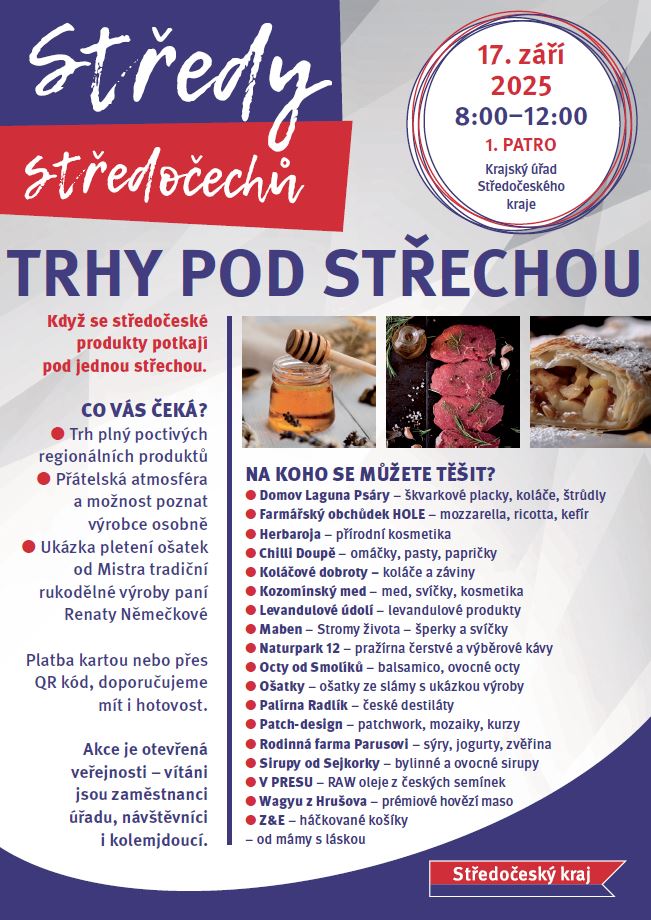 Středy Středočechů jsou pravidelnou akcí pořádanou Středočeským krajem, která propojuje svět úřadu s lidmi, kteří tvoří hodnoty v našem regionu – s lokálními výrobci, farmáři a řemeslníky. Jednou za čas, vždy ve středu, se bistro u sálu zastupitelstva na Krajském úřadě promění v malý trh plný poctivých produktů, domácích dobrot a přátelské atmosféry.
