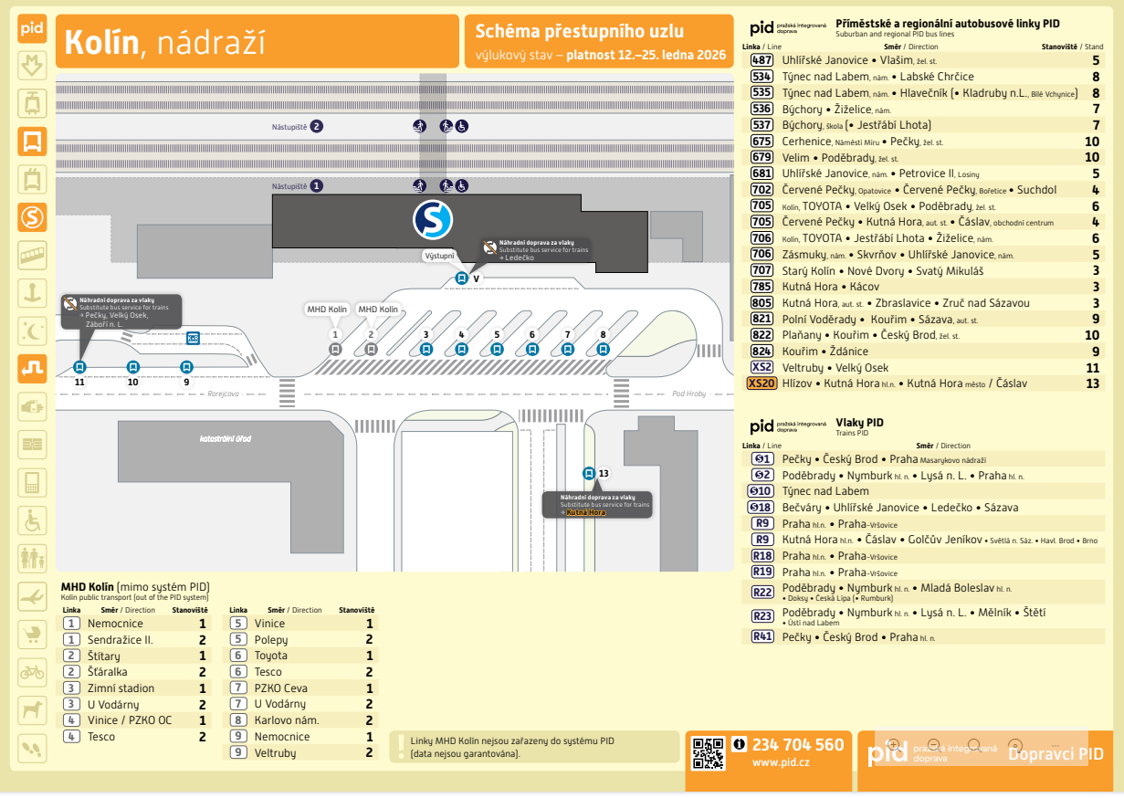V termínu 5.1.2026 – 25.1.2026 bude omezen provoz vlaků v úseku Kolín – Kutná Hora hl. n. Na tomto úseku bude zachován provoz pouze linky R9. Za linku S20 bude zavedena linka náhradní autobusové dopravy XS20 jedoucí v následující trase: