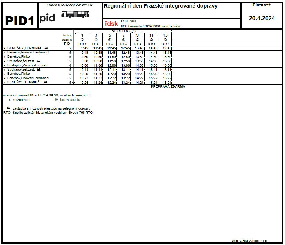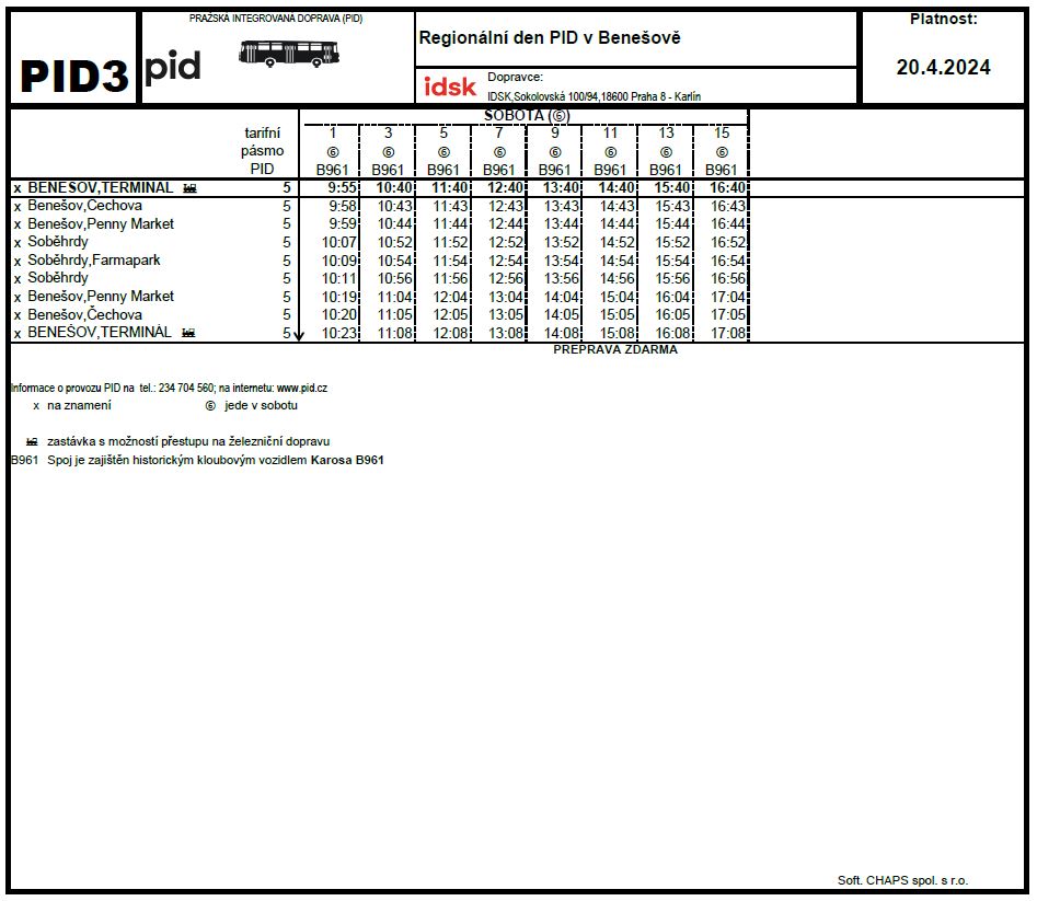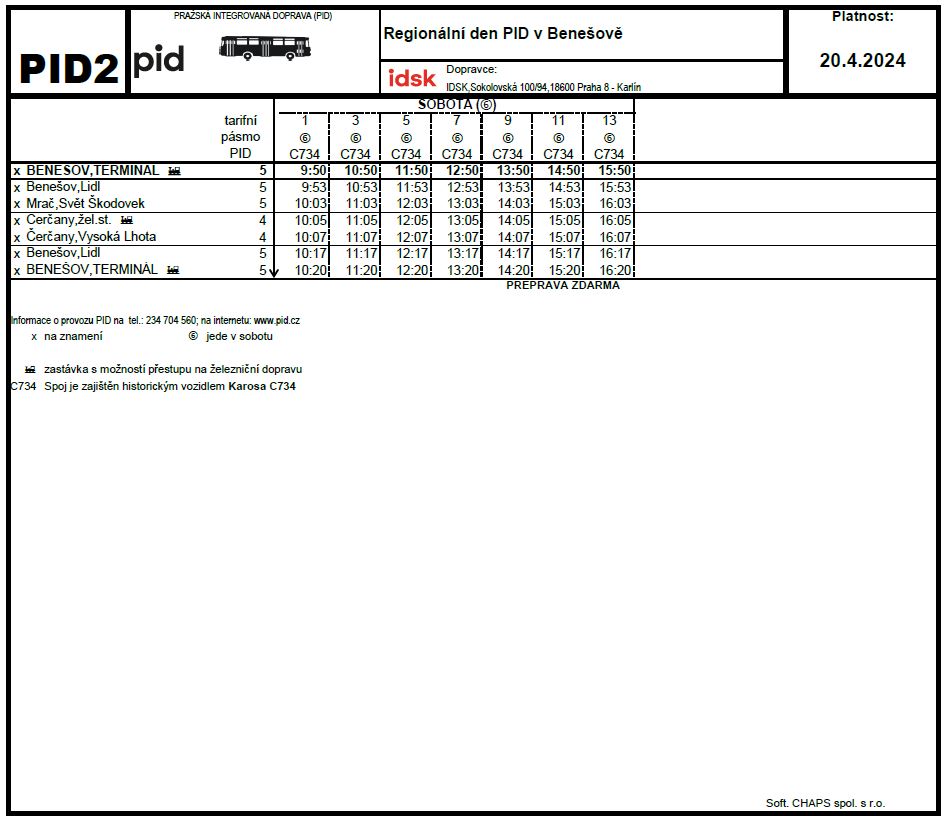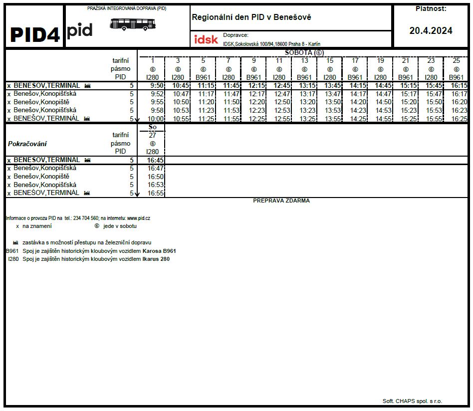 V sobotu 20. dubna 2024 se ve vlakové stanici a v autobusovém terminálu v Benešově u Prahy uskuteční Regionální den PID. Téměř po celý den od 10:00 do 17:00 hod. se můžete těšit na jízdy historickými autobusy, speciálními vlaky a bohatý doprovodný program.