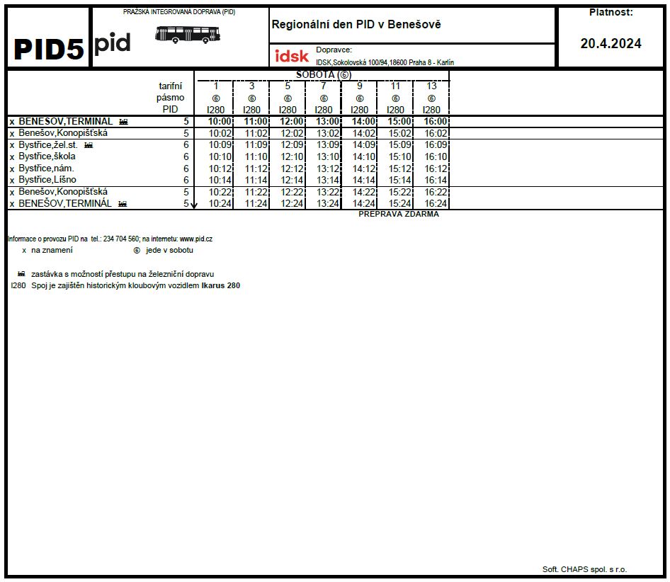 - linka “PID 5” pojede v okružní trase Benešov, Terminál – Bystřice – Benešov, Terminál.
