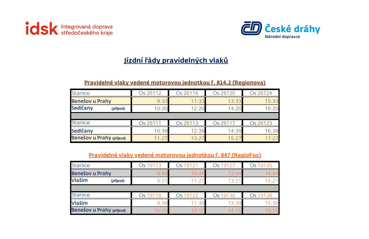 - Nasazení nové motorové jednotky RegioFox (847) v barvách PID na vybraných pravidelných spojích linky S99 Benešov u Prahy – Vlašim a zpět.