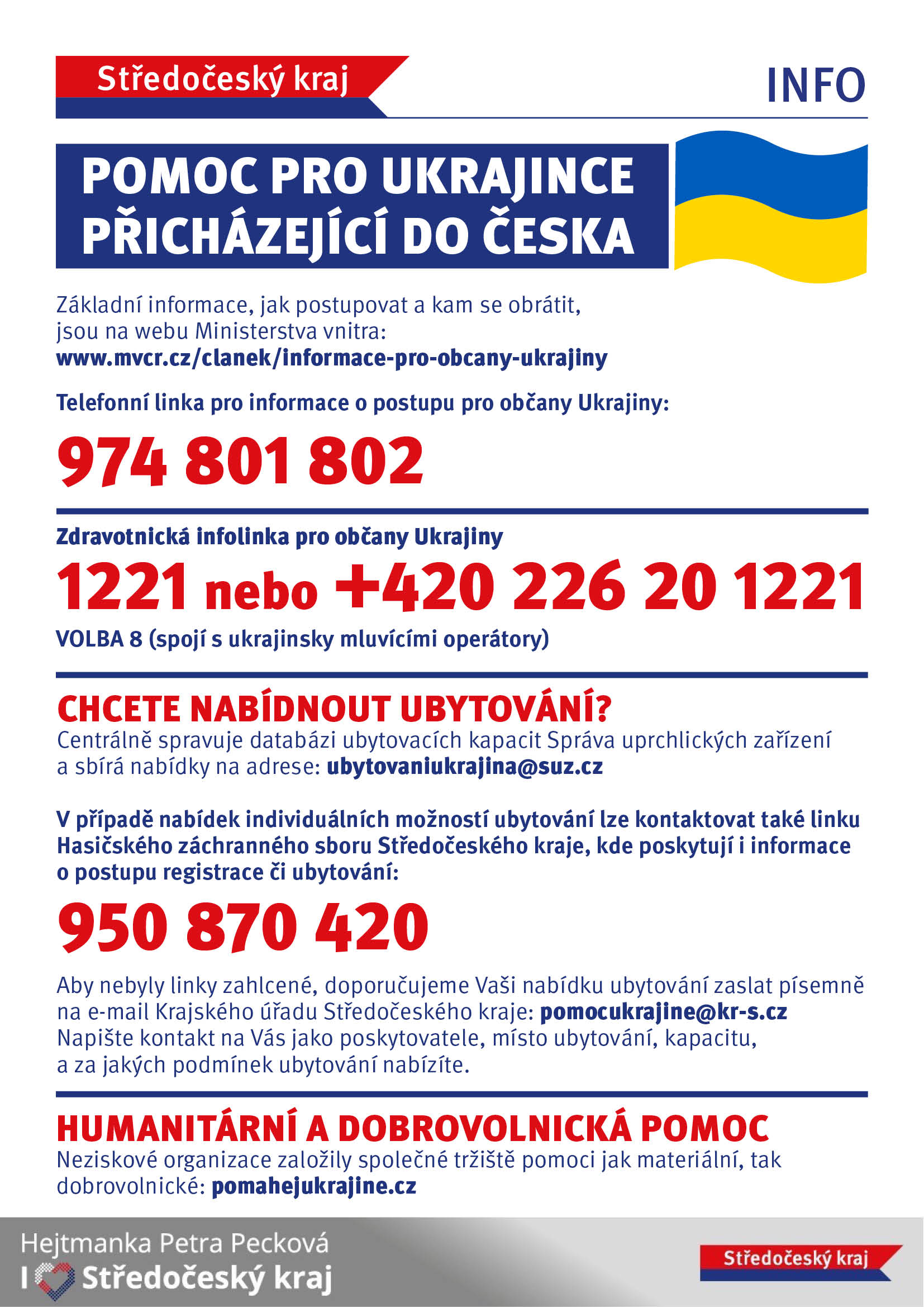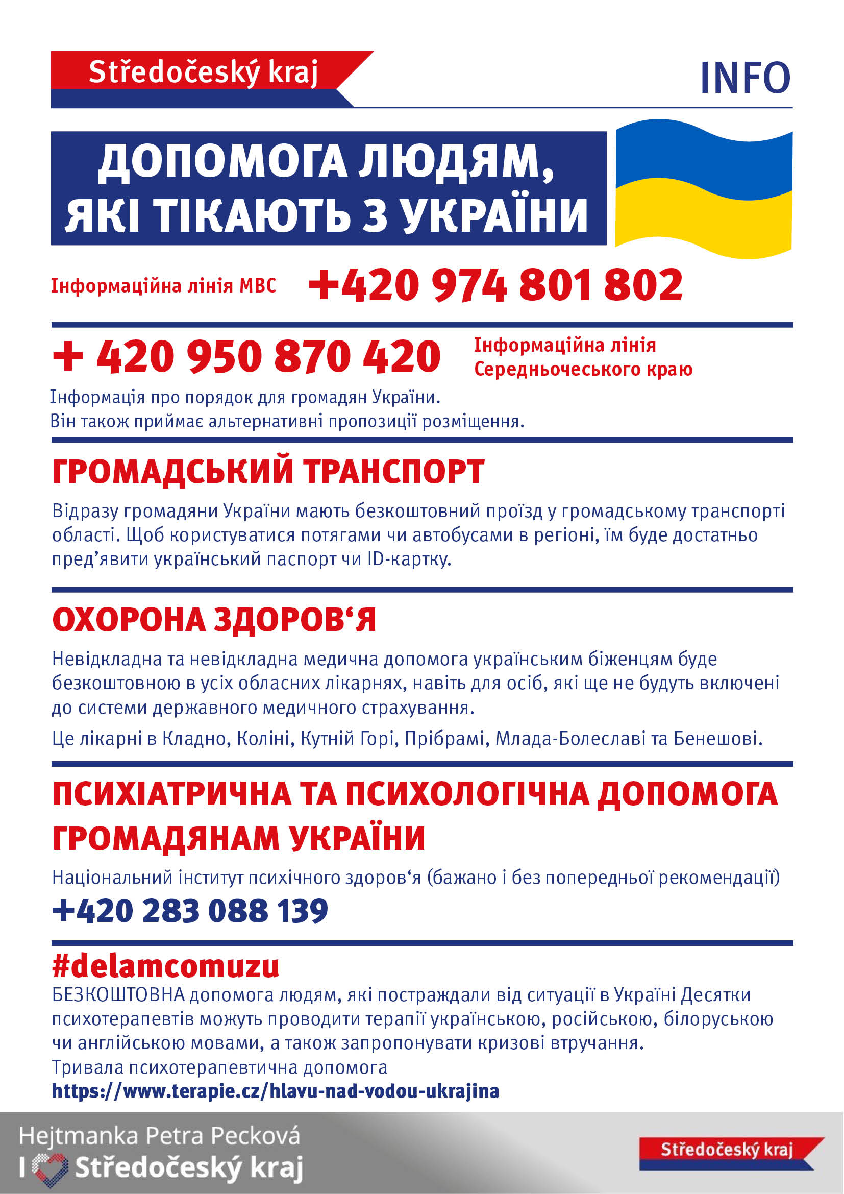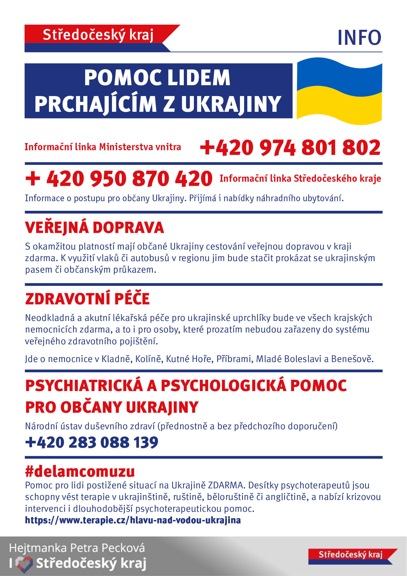 Středočeský kraj připravuje informační letáky k pomoci Ukrajině, které jsou k dispozici všem zájemcům. Vznikají ve dvou jazykových mutacích, v češtině a ukrajinštině. Jejich využití je možné jak na sociální sítě, tak například k vytištění a umístění například ve vývěskách obcí, spolků, v knihovnách či v obchodech.