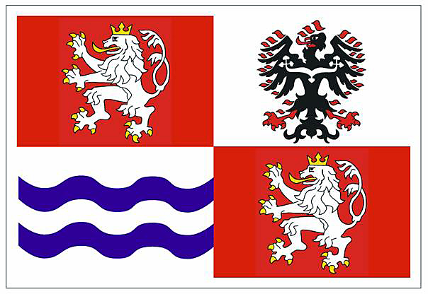 Červeno-bíle čtvrcený list, v horním žerďovém a dolním vlajícím poli český lev, v dolním žerďovém poli dva vlnité modré pruhy, v horním vlajícím poli černá plamenná orlice s červenou zbrojí a bílým perizoniem.