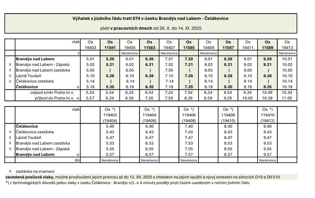 IDSK reaguje na rozsáhlé dopravní omezení v úseku křížení dálnic D0 a D10 a v ranní špičce pracovních dní zavede posilové vlaky na trati 074 Brandýs nad Labem – Čelákovic