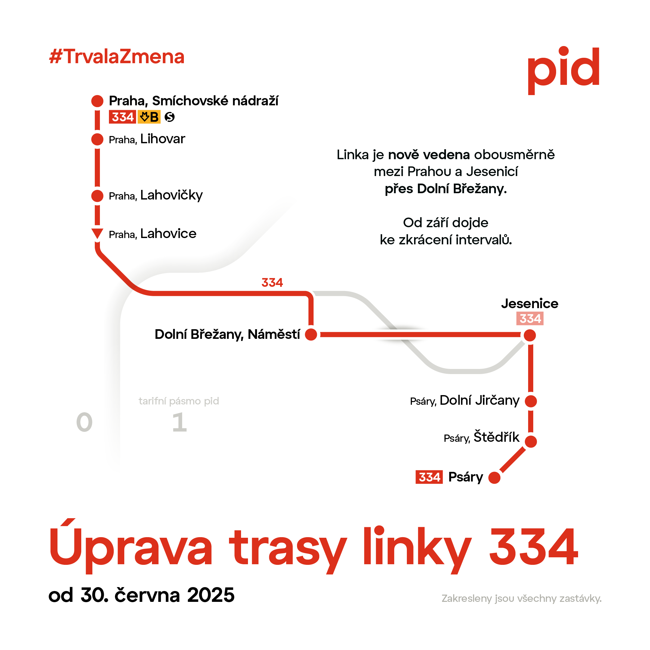 Od začátku letních prázdnin dochází také k několika trvalým změnám na autobusových linkách ve Středočeském kraje s termínem změny od pondělí 30. 6. 2025. Nejvýznamnější změnou je přetrasování expresní autobusové linky 334 mezi Jesenicí a Smíchovským nádražím přes Dolní Břežany.