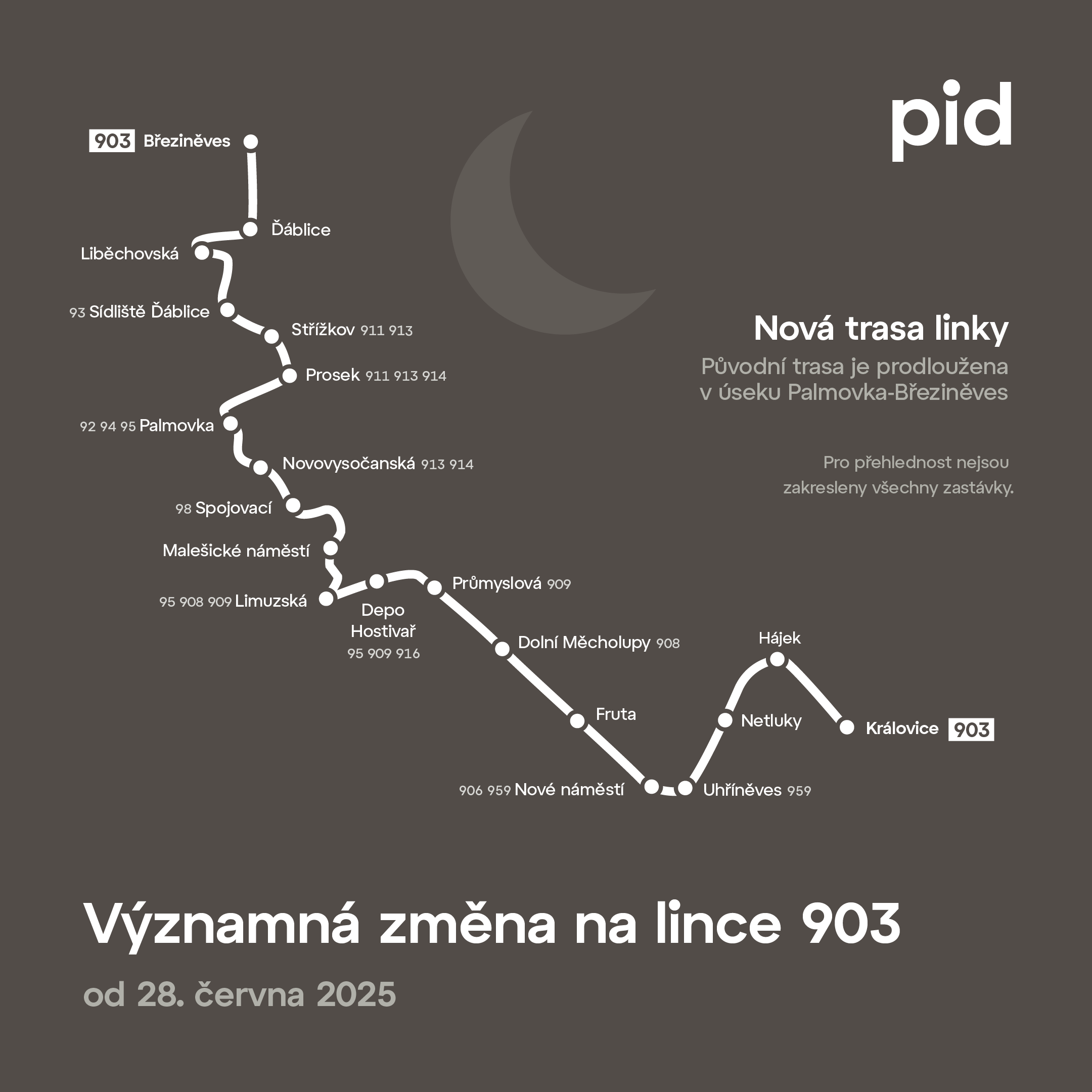 - 903 Linka je nově vedena v trase Březiněves – Ďáblice – Prosek – Kundratka – Libeňský zámek – Palmovka – Sídliště Malešice – Depo Hostivař – Uhříněves – Královice (oproti původní trase je prodloužena o úsek Palmovka – Březiněves a nově nezajíždí do Štěrbohol). Zkrácení intervalu ze 120 na 60 minut.