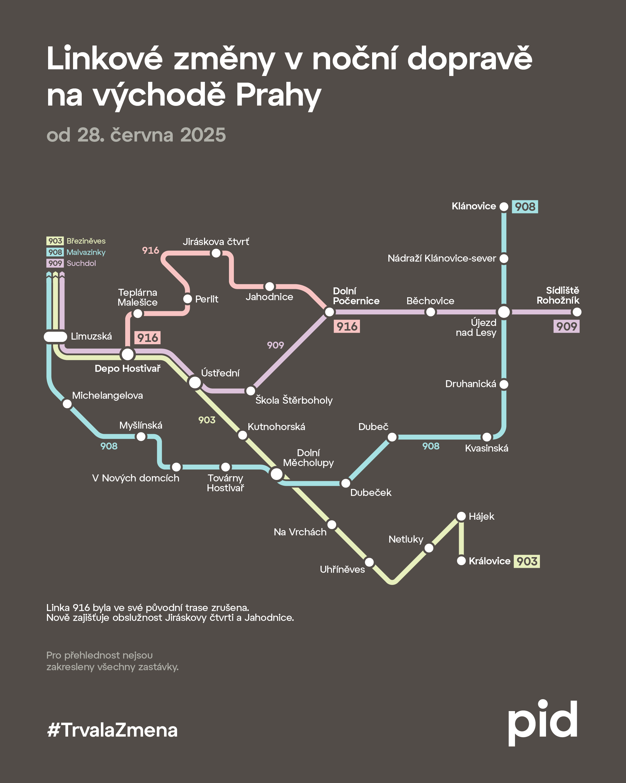 - 916 Linka je v původní trase Palmovka – Prosek – Kbely – Vinořský hřbitov zrušena a nahrazena linkami 903 a 914. Číslo 916 je použito pro novou linku v trase Depo Hostivař – Teplárna Malešice – Perlit – Pávovské náměstí – Sídliště Jahodnice – Dolní Počernice (noční provoz celotýdenně v intervalu 60 minut).