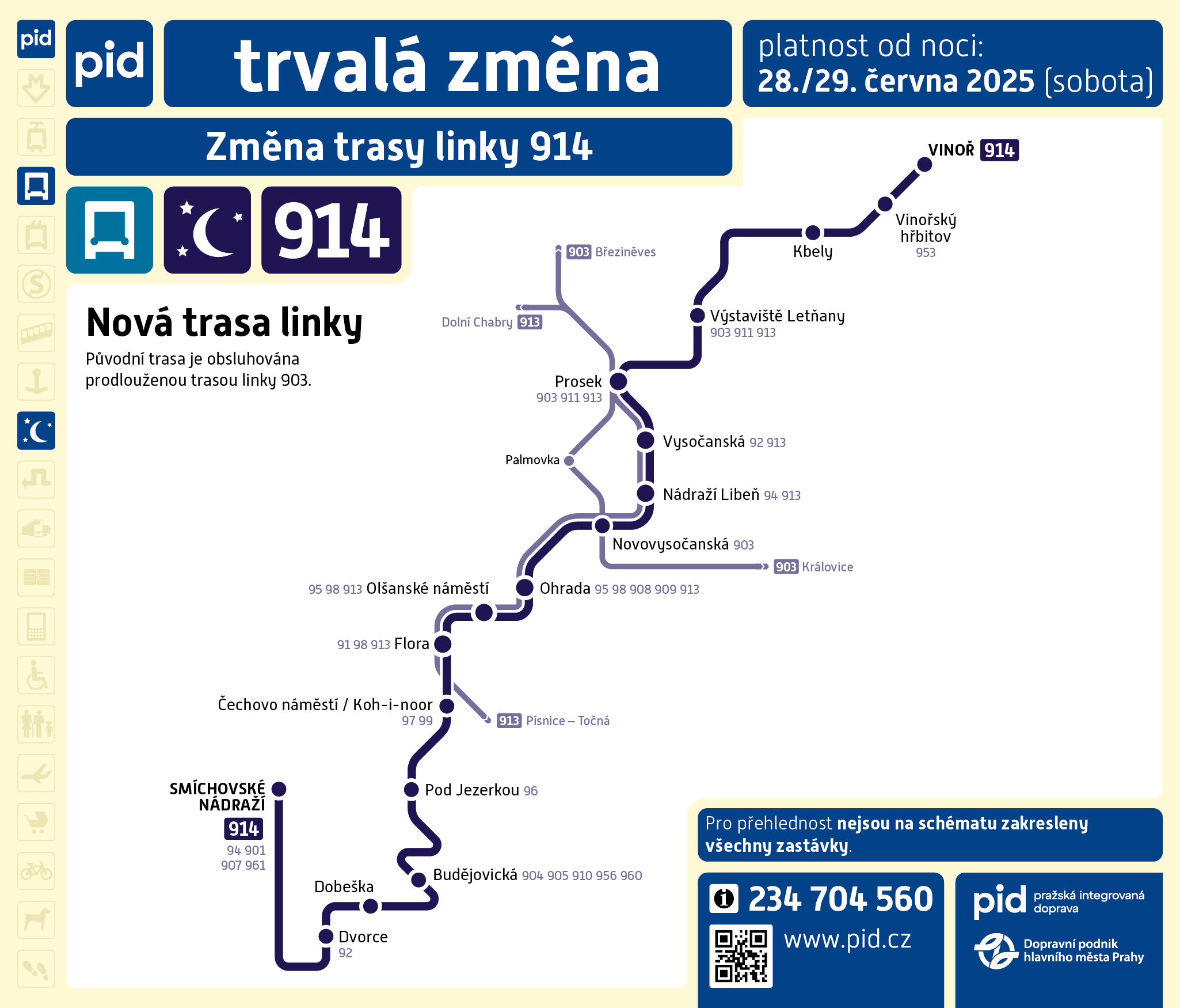 - 914 Linka je v původní trase Březiněves – Ďáblice – Třebenická zrušena a nahrazena nově trasovanou linkou 903. Číslo 914 je použito pro novou linku v trase Smíchovské nádraží – Dvorce – Zemanka – Ryšánka – Poliklinika Budějovická – Budějovická – Michelská – Bohemians – Bělocerkevská – Flora – Rokycanova – Ohrada – Nádraží Libeň – Vysočanská – Prosek – Rychnovská – Toužimská – Kbely – Vinořský hřbitov – Vinoř (noční provoz celotýdenně v intervalu 60 minut).