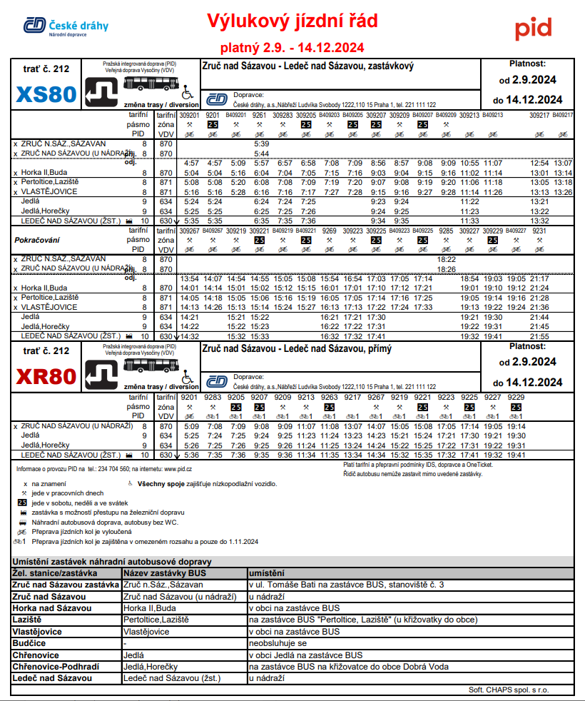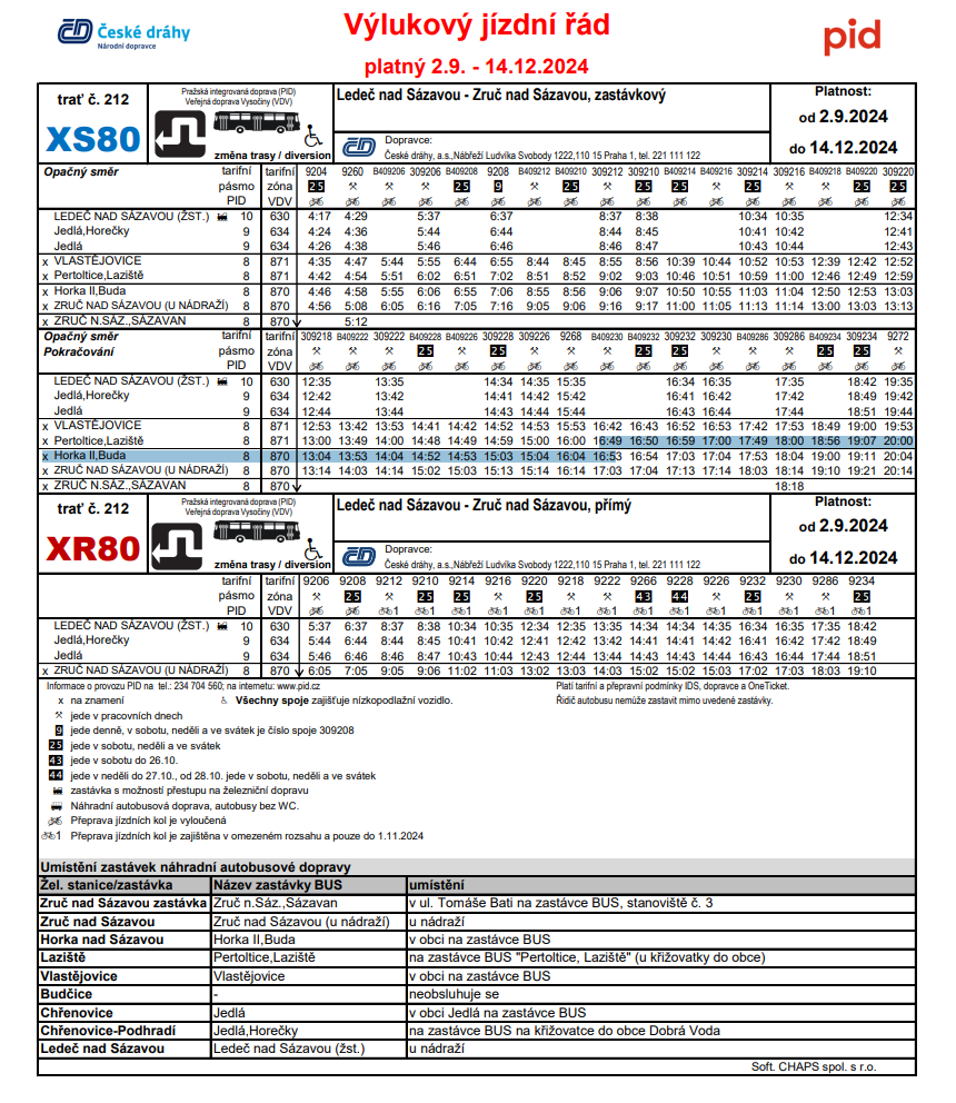 Zastávková linka XS80 zajistí spojení do obcí ve vyloučeném úseku tratě. Cestující upozorňujeme, že spoje náhradní autobusové dopravy budou v některých případech zastavovat na silničních komunikacích blíže center jednotlivých obcí a nebudou zajíždět k vlakovým zastávkám. Zastávka Budčice nebude během výluky obsluhována. Tato linka bude mít přípoj buď ve Zruči nad Sázavou, nebo v Ledči nad Sázavou.