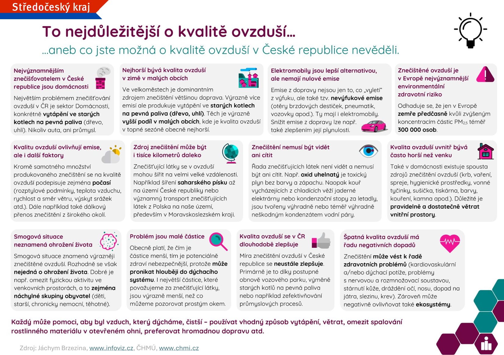 Kvalita ovzduší závisí z velké části na lidské činnosti a každý z nás může přispět ke zlepšení. Nejlepší cestou, jak zlepšení dosáhnout, je abychom měli správné a jasné informace o tom, jaká je úroveň znečištění, co ji ovlivňuje, jak ji lze zlepšit, popř. jaké jsou dopady zvýšené úrovně znečištění. Právě osvěta v oblasti kvality ovzduší je cílem těchto stránek, které obsahují spoustu důležitých informací, odkazů na další zdroje a představují určité verze ukazatelů pro ty, kteří chtějí o kvalitě ovzduší vědět více.