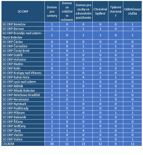Na území Středočeského kraje působí 38 domovů pro seniory, 11 domovů se zvláštním režimem, 12 chráněných bydlení, 6 týdenních stacionářů, 11 odlehčovacích služeb a 21 domovů pro osoby se zdravotním postižením, jejichž zřizovatelem je Středočeský kraj.